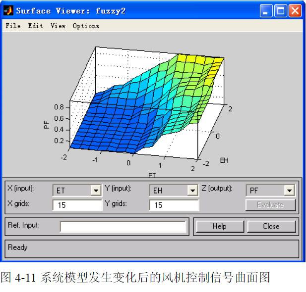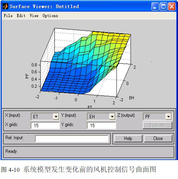 從仿真曲面圖中可以清楚的看到,當系統(tǒng)模型發(fā)生變化時,風機的控制策略也隨著發(fā)生變化,體現(xiàn)了系統(tǒng)的智能性和自適應(yīng)性。