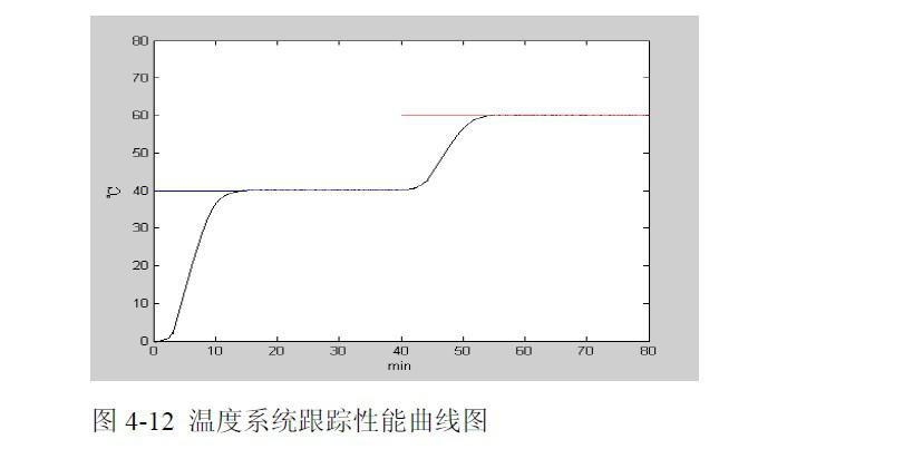 輸出變量經(jīng)過模糊判決后輸出的控制量在0—1 之間,表示各個執(zhí)行器的運行功率與運行功率的比值。采用對數(shù)型激活函數(shù)而沒有用模糊神經(jīng)網(wǎng)絡(luò)的輸出直接作為最終輸出的目的是為了讓執(zhí)行器能夠平滑過渡,減少磨損,延長使用壽命。環(huán)境試驗箱溫度系統(tǒng)仿真結(jié)果環(huán)境實驗箱在初始時刻設(shè)定跟蹤溫度為 40℃。在40 分鐘后設(shè)定為60℃。,誤差在2℃以外采用強制加熱或強制冷卻,在距離跟蹤目標的誤差在2℃以內(nèi)啟動模糊控制策略,系統(tǒng)動態(tài)跟蹤性能如圖所示: